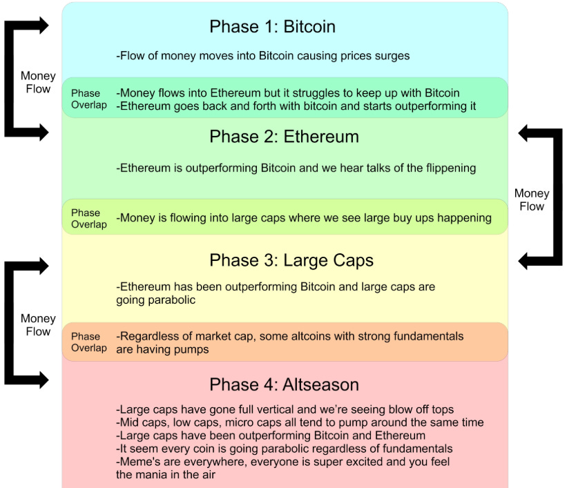 In the crypto industry, products don’t ship unless the market has sufficient liquidity. Why waste the effort for no reward? When investing in low market cap tokens, understand the order of liquidity. Timing is important. Right now we see BNB and SOL beginning to take ETH market share; we can interpret that as moving from Phase 2 to Phase 3 of the cycle.
